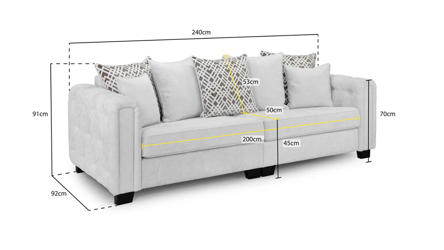 Dimension: Length: 240 cm, Depth: 92 cm, Height: 91 cm, Floor to Seat Height: 45 cm, Back Rest Height: 53 cm