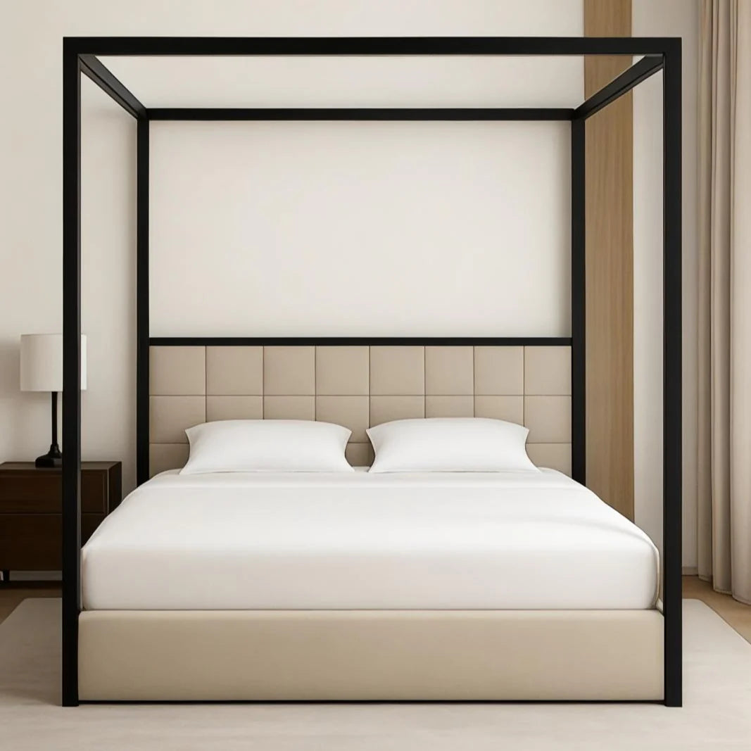 A modern canopy with tailored poise. Grosvenor sets a slim, square-profile metal frame around a low, grid-tufted headboard and a clean, upholstered base—bringing boutique-hotel calm to any room.