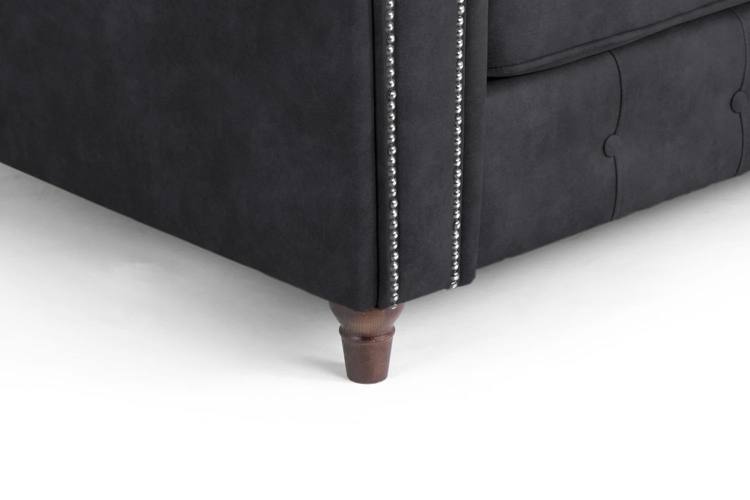 The Oakland range is upholstered in a soft suede-like fabric, with large scroll arms and button detailing, this brings class to any room with its striking British design