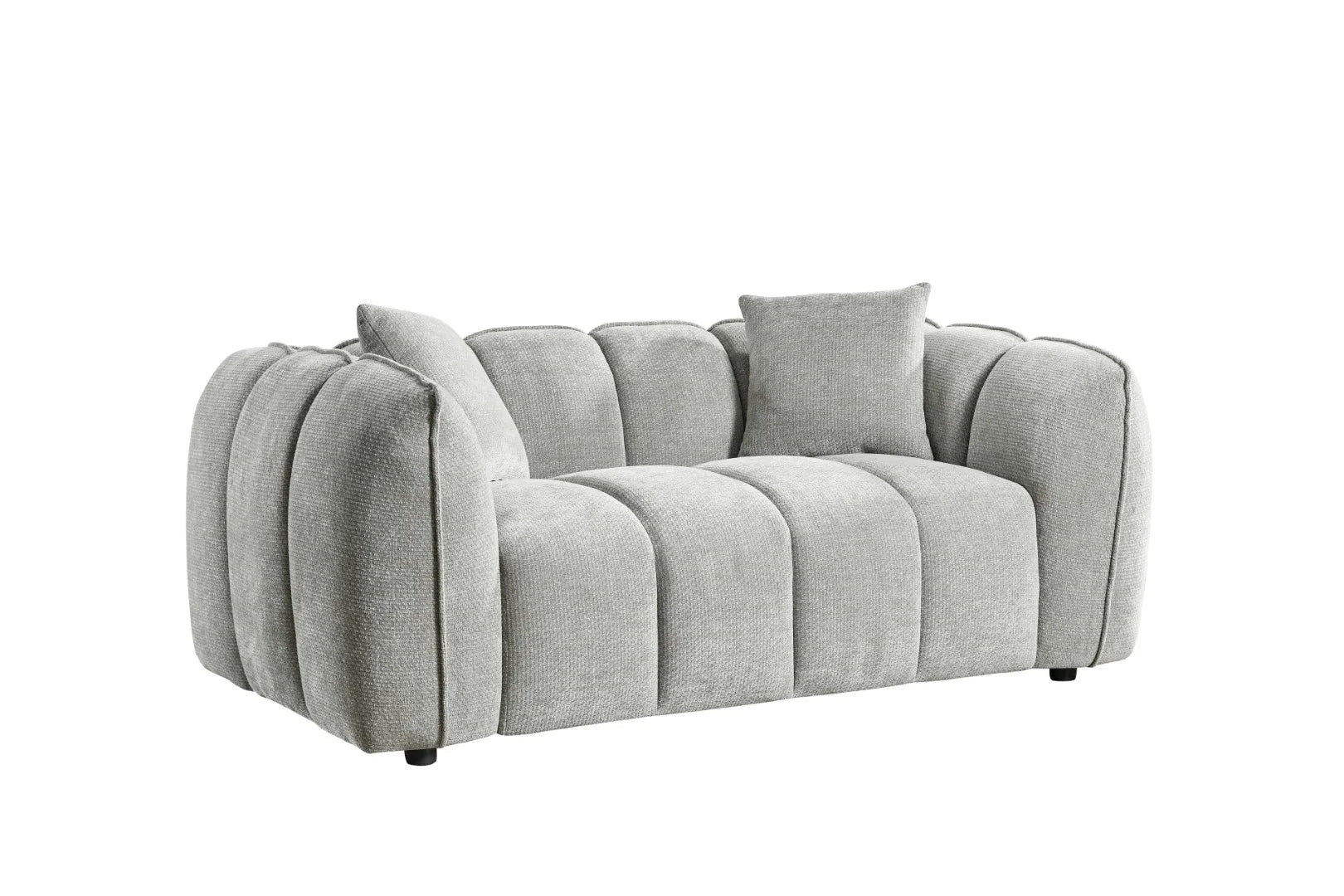 Designed with a distinctive channeltufted profile and sumptuously soft upholstery, it brings a contemporary touch to any living space. Generously cushioned with deep seating and matching throw pillows, this sofa is perfect for lounging and relaxation.